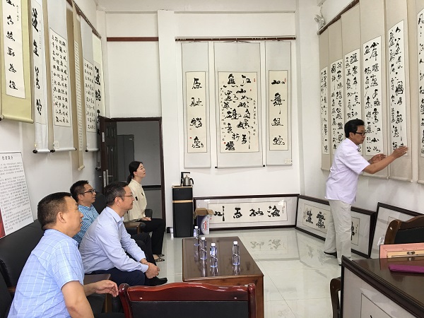 調研組一行仔細欣賞了饒永才書畫工作室陳列的書畫作品,詳細了解工作室成立情況。饒永才就書畫工作室的書畫作品一一作了詳細講解,并分享了他幾十年來在書法藝術道路上的心路歷程。