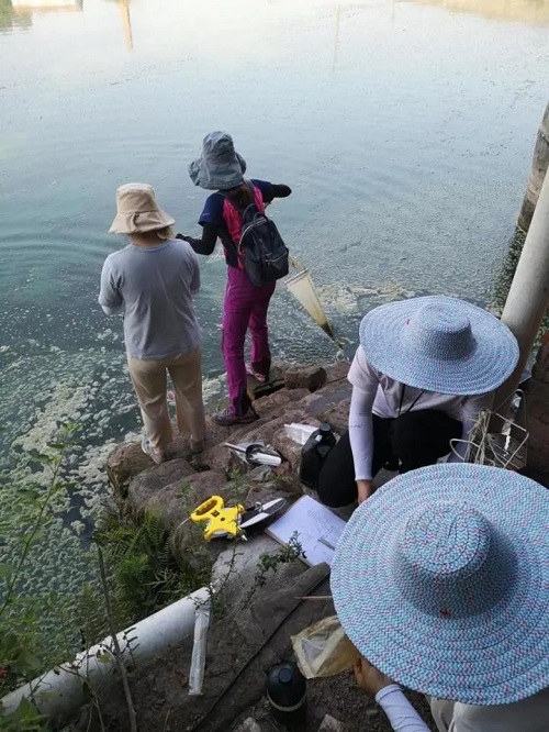 圖為陶敏(前排左二)帶領(lǐng)學(xué)生開展四川丘陵水庫水質(zhì)與水生生物調(diào)查
